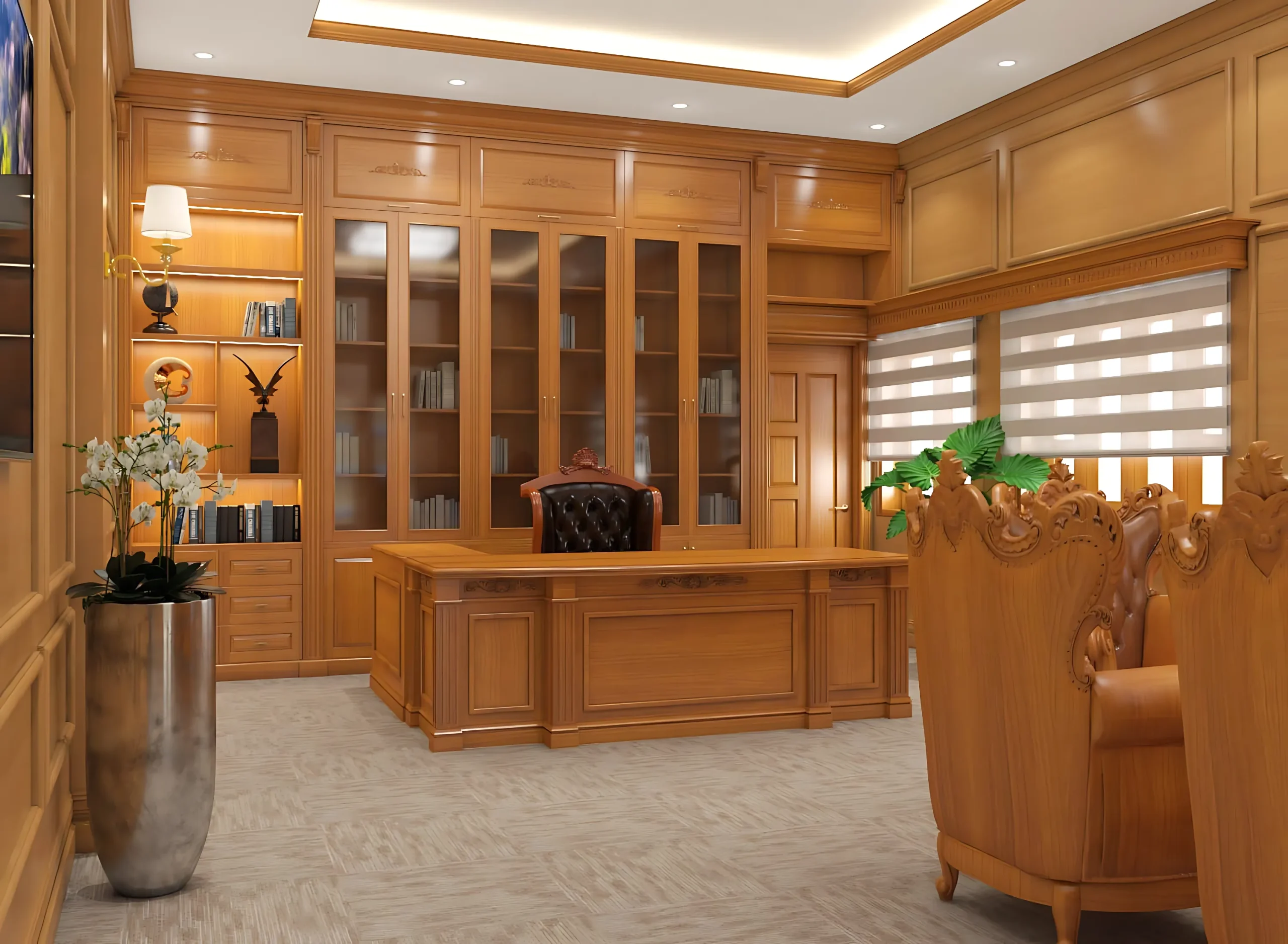 Thiết kế và thi công phòng làm việc lãnh đạo với nội thất cao cấp, sang trọng, bố trí hợp phong thủy, đảm bảo sự tiện nghi và đẳng cấp.